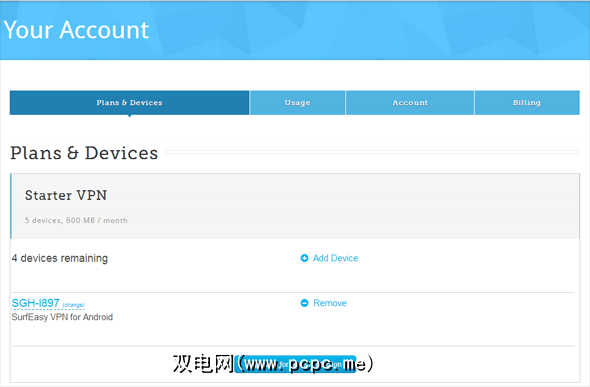 如果您跳至Internet,则可以转到SurfEasy网站并登录到您的帐户那里。然后,您将看到一个Web仪表板,可用于控制和管理SurfEasy帐户:管理与该帐户关联的设备,带宽使用概述以及非免费用户的账单信息。