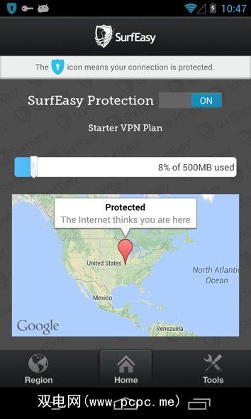 另一页通过快速切换按钮显示和打开SurfEasy的连接状态。此页面还将告诉您SurfEasy认为您在哪里(用于确定上面的“优化"服务器)以及到目前为止已使用了多少每月带宽分配。