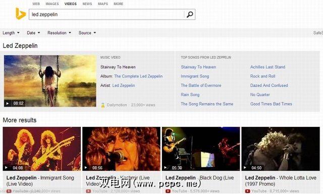 Bing经常从大多数互联网用户那里得到一笔原始交易,这些用户对Google搜索所提供的功能太满意了。每当在Bing上搜索公认的歌手时,这就会立即显示来自YouTube,Vimeo,MTV和Artist Direct等网站的音乐视频。