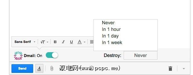 这非常简单。安装扩展程序后,您将在``撰写''窗口中看到一个Dmail切换开关以及一些将电子邮件设置为自毁的选项。您可以完全控制发送的每封电子邮件保持Dmail开关处于打开状态。