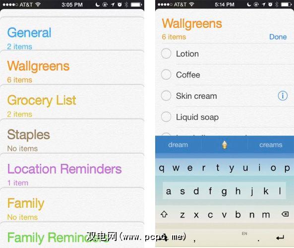 添加简单提醒可以通过2或3次点击完成:点击列表,点击并键入提醒;再次点击以设置日期和时间,最后点击完成。该应用程序还允许重复提醒。