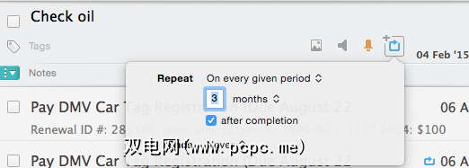 2Do是我选择的个人管理应用程序,我发现最方便的功能之一是完成后提醒。完成后提醒是重复的提醒,但是它们仅在您为同一任务选中最后指定的提醒后才会重复出现。因此,例如,我提醒我每三个月检查或更换汽车中的机油一次-但我要等四个月才能完成该任务。在我检查上一个任务之前,不会自动再次提醒该任务。这样,仅在完成任务后和设置时间后再次提醒您。
