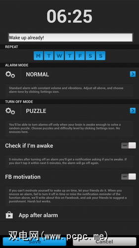 几个值得注意的选项:“检查我是否醒着"会在警报消失5分钟后显示一条通知,确保您保持清醒。如果您不轻按通知,则闹铃会响起。请注意,关闭(滑动)通知与点击通知并不相同:如果您只是将其关闭,则“拼图闹钟"仍会在五分钟后再次响起。如果您没有醒来,“ FB动机"功能大概会在您的Facebook订阅源上发布令人尴尬的内容,从而鼓励您的朋友“建议惩罚"。最后,您还可以选择在解除警报后立即启动应用程序。