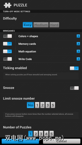 由于您可以控制难度,甚至选择一个接一个地解决几个难题,因此这是一种有效的唤醒方式。您确实需要了解自己:设置一系列困难的难题很容易,这些难题会让您彻底烦恼起来,或者只是沮丧地关闭手机然后重新入睡(这始终是一种选择)。