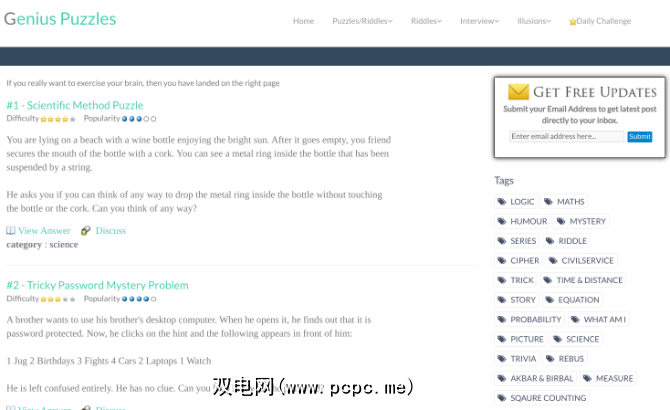 该网站上的谜题涵盖了各种见解,谜语,演绎,实用,数学,侦探,国际象棋,横向和科学。您还可以选择难度级别(如果您要向孩子们展示网站,这将很有用)或浏览该部分中的所有难题。然后只需再次单击以显示解决方案,这样您就不会为时已久。