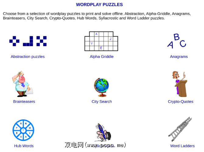 有九种打印类别来自填字游戏,单词搜索,数独,逻辑谜题,脑筋急转弯,数字,文字游戏,测验和儿童游戏。这些类别都没有一个庞大的收藏品,但是可打印的书籍种类繁多,足以让任何人忙碌和娱乐几天。