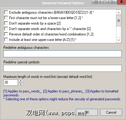 该应用程序的高级选项确实允许您完善密码生成器方法,以使所有内容都完全符合您的要求。