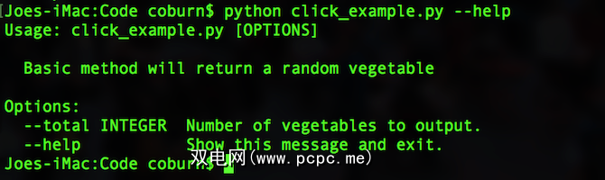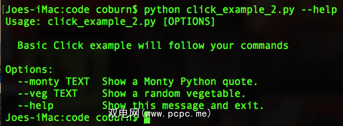 import clickimport [email protected]()@click.option('--monty', default=False, help='Show a Monty Python quote.')@click.option('--veg', default=False, help='Show a random vegetable.')def do_work(monty, veg): """ Basic Click example will follow your commands""" if monty: print('What\'s this, then? "Romanes eunt domus"? People called Romanes, they go, the house?') if veg: print(random.choice(['Carrot', 'Potato', 'Turnip']))if __name__ == '__main__': do_work()此Click示例在16行代码中实现了相同的逻辑。将为您解析参数,并生成帮助屏幕: