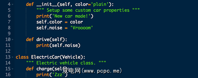在 ElectricCar 之后定义了strong>,则在两个方括号内指定了车辆类。这告诉Python ElectricCar 是 Vehicle 的子代。这样,它就可以访问车辆中提供的所有数据和方法。