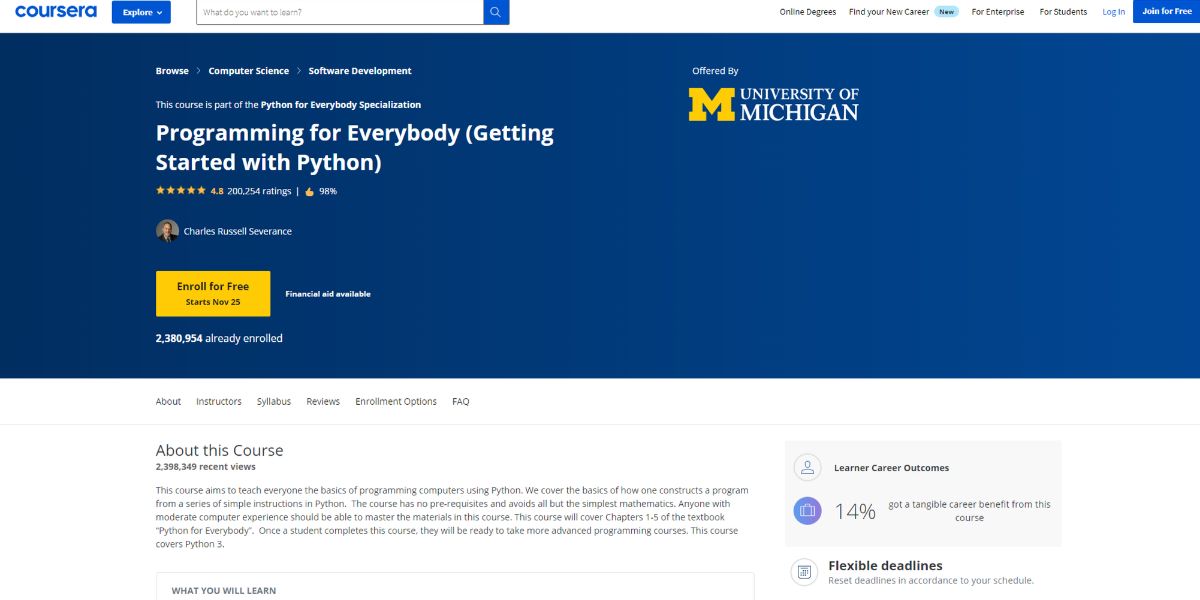 讲师设计课程内容的方式是,如果您认真学习课程内容,您就可以成为一名 Python 编码员。如果您对计算机和简单的数学有基本的了解,这是一个额外的优势。到目前为止,已有 2,379,916 名学习者注册了该课程。