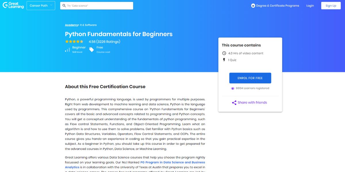它以视频格式提供有关基本 Python 编程的免费学习内容。该课程需要四个小时才能完成。在课程结束时,将进行学习评估测验。