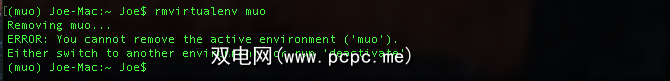 rmvirtualenv muo确保当前未在使用该环境,否则会出现错误: