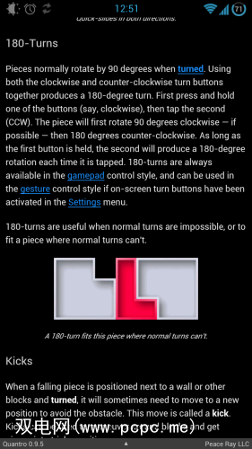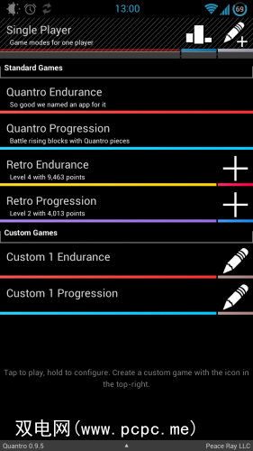 由于名称的版权问题或某些商业限制,他们不能告诉您它是俄罗斯方块。因此,在这里我要说明事实。当Quantro开发人员Peace Ray说游戏具有“ 经典摔倒的Tetromino"时,这真的意味着Tetris。这并不是第一次尝试在Android上提供良好的Tetris替代体验,但是如果您看一下Matt在2011年发布的文章中列出了4种适用于Android的类似Tetris的出色游戏,您就会发现事情已经发生了多远。 p> 顺便说一句,如果您正在寻找出色的俄罗斯方块替代品,但希望在线而不是在Android手机上玩,请查看我们最近发布的有关最佳俄罗斯方块克隆的文章。 Quantro带有多种游戏模式,包括多人游戏(通过Wi-Fi或Internet)和单人游戏。在这篇评论中,我将只介绍单人游戏功能,其中有很多功能。您可以选择四种类型的单人游戏之一,也可以创建自己的自定义类型(稍后将介绍): 两种主要的游戏类型是Quantro和Retro。 Quantro是这款游戏在俄罗斯方块上的独到之处,并包含一些非常疯狂的功能。 Retro只是普通的旧俄罗斯方块,却拥有美丽的新外观。每种类型都可以在“耐力"模式(就是从天上掉下来的砖头)或“进步"模式下演奏,在这种模式下,您还必须应对成排的砖头掉出地面的情况,这会使您的生活变得越来越困难。游戏进展。 至少在我看来,这种模式使游戏“比俄罗斯方块更好"。简单地说,它是这样的: 您在这里看到的是两层,而不仅仅是静态背景。红色层位于前面,蓝色层位于背景中。现在,我收到了一个红砖,因此您可以在红色层上看到其阴影轮廓,这意味着它正好在蓝色层的前面。着陆时,它将与现有的砖块融合在一起以创建一个统一的块: 这不仅是一个很酷的效果,而且实际上使查看砖块的整体形状更加容易。因此,这是Quantro的最基本形式,但是从那里开始,游戏可能会变得非常疯狂。如果您正在寻找挑战,请点击右上角会弹出一个特殊的积木,例如: 首次获得特殊积木时会附带说明。 :例如,此3D正方形跨越两个图层。可以在层之间移动另一个称为Flash的特殊砖,因此您可以决定是要在蓝色层还是红色层上 即使您不触发特殊砖,Quanto也会有时,您可以一次丢掉两块砖,每层一层,挑战您: 在这里,您会看到一个红色的“点"和一条蓝线。如果看一下它们的轮廓,即使蓝线碰到蓝色正方形,红点仍将继续下降。这打开了一些非常有趣的选项,但也意味着您必须同时考虑这两层。 完成一个关卡后,您可以选择继续到下一个关卡,或者返回并尝试再次获得更高的分数(或更少混乱的面板): 如果所有这些特殊积木和双层游戏玩法似乎都太疯狂了,您也可以玩Quantro在Retro模式下,基本上类似于Tetris,但外观要好得多: 因此,这里只是单层,没有特殊的积木,但是有一些视觉效果。如果两块相同颜色的砖块碰在一起,它们将融为一体,就像Quantro样式一样。这可以创建各种有趣的形状: 它不影响游戏玩法-您仍然只需要创建整行来消除积木-但这看起来不错。 Quantro并不限制您使用它附带的两种游戏类型:您可以创建自己的自定义游戏,指定所需的控件类型,应该获得的砖块类型,以及您希望板上有多少行和列。在大多数情况下,这行之有效-但并非总是如此。 有一种持久且简单的方法可以使Quantro崩溃,至少在我的Galaxy S III上:创建具有最大行数的自定义游戏和列。看起来像这样: 并且成功地产生了这样的结果: 使用更保守的设置创建游戏确实可行。 Quantro不仅引入了许多新形状和特殊作品,还引入了一些独特的控件:例如,您可以将作品旋转180度。这就是为什么其文档如此重要并提供以下内容的原因: 游戏中的文档清晰且编写得井井有条,并且有动画演示了不同的动作。您无法在上面的静态屏幕截图中看到此内容,但是我在此处显示的插图实际上在移动,显示红色部分旋转了180度。 如果您要在Android上寻找一款出色的俄罗斯方块游戏,几乎找不到Quantro,因为它不包含那些非常重要的关键字。但是一旦您发现它并尝试一下,我想您不会再这么快地寻求另一种俄罗斯方块体验。一旦开发人员修复了令人讨厌的崩溃错误,Quanto就将完美。强烈推荐。 如果您想要一些更出色的Android游戏,则可以随时查看我们的“最佳Android游戏"列表! Quantro模式