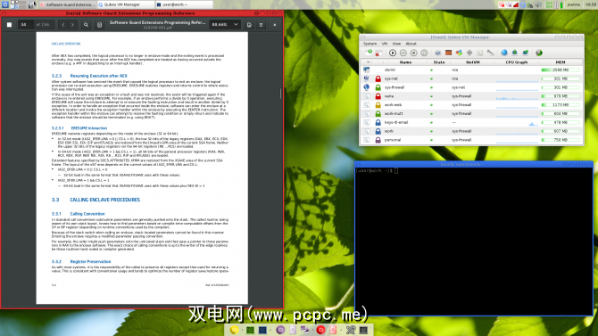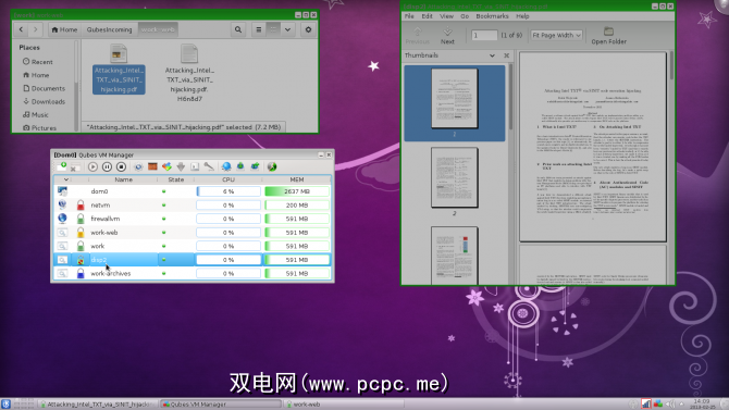 Qubes OS使用Xen虚拟机管理程序隔离不同的虚拟机。仍然有一个管理域D0m0。该管理域具有对每个硬件的访问权限。此外,Dom0托管诸如图形用户界面(GUI)和诸如键盘和鼠标之类的外围设备。但是,由于具有GUI,因此应用程序看起来就像在单个桌面上运行一样。而是将应用程序隔离在虚拟机中。 Qubes OS使用Application Viewer来使应用程序在本机桌面上运行。