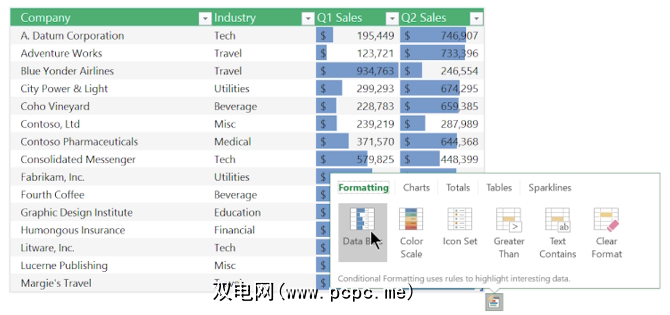 例如,在“格式"类别中,您可以将鼠标悬停在数据栏上预览按数据值按比例填充的所有数字单元。在总计类别中,您可以将鼠标悬停在总和上以查看所选内容中所有列的总和。如果您想让预览变得真实,请单击鼠标,而不是将鼠标悬停。
