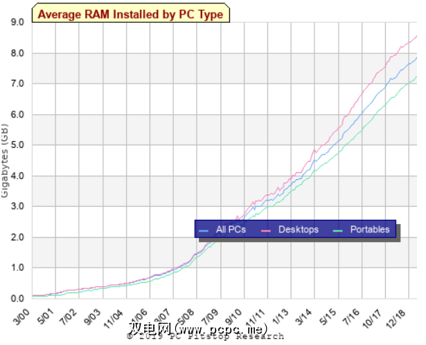“ 640K应该在这个世界上,智能手机通常会配备4GB或更多的RAM,而Google Chrome这样的浏览器在分配内存时却又快又慢,因此节俭RAM已经成为过去。在所有硬件类型上,平均已安装RAM数量也在增加。