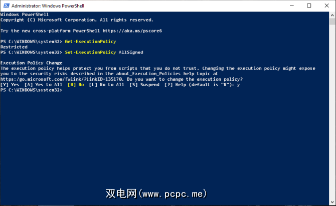 如果返回 Restricted ,请键入 Get-ExecutionPolicy 。 >则意味着您无法安装任何脚本。要绕过它,请输入 Set-ExecutionPolicy AllSigned 和“ Y"以确认更改。