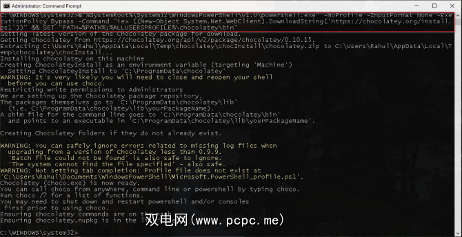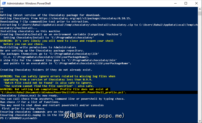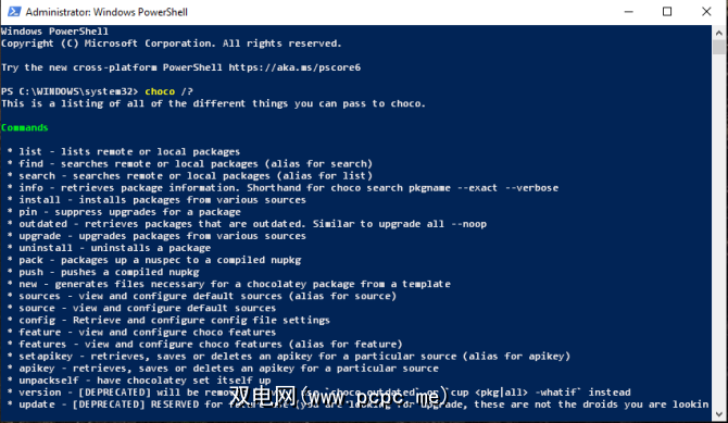 一旦Chocolatey安装完成,重新启动PowerShell,然后键入 choco /?以查看命令列表。
