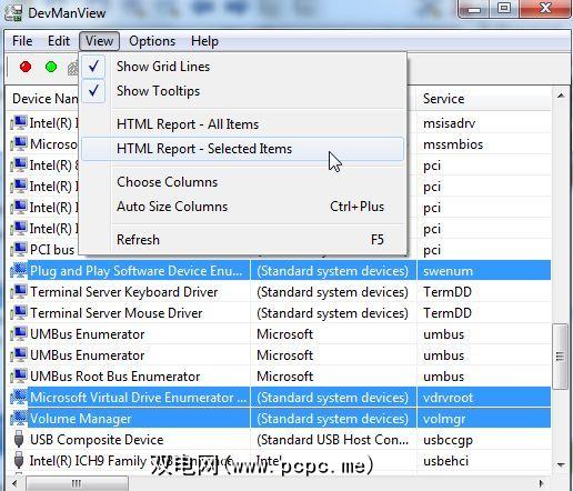 如果您只想保存有关少数设备而不是整个列表的信息,只需使用CTRL键单击选择一些设备,然后在“ View "下将其导出即可选择项目到HTML文件。该程序将报告保存到DevManView目录中的本地HTML文件中,并在默认浏览器中打开报告。