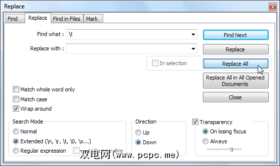 在扩展模式下,Notepad ++将接受一些与特殊字符匹配的特定转义序列-例如,您可以搜索和替换换行符,回车符或制表符。以下是一些最常用的转义序列: