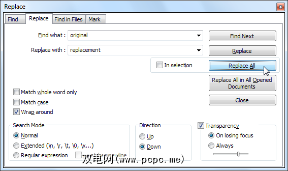 尽管这是一个基本的单文档搜索,并且不使用正则表达式进行替换,但是您可以对其进行大量自定义。例如,如果您只想搜索和替换文件一部分中的文本,请启用此处的选择中复选框,然后用鼠标在文件中选择文本的一部分。您还可以启用仅匹配整个单词或区分大小写复选框–默认情况下,Notepad ++执行不区分大小写的搜索并匹配所有文本,无论是整个单词还是全部