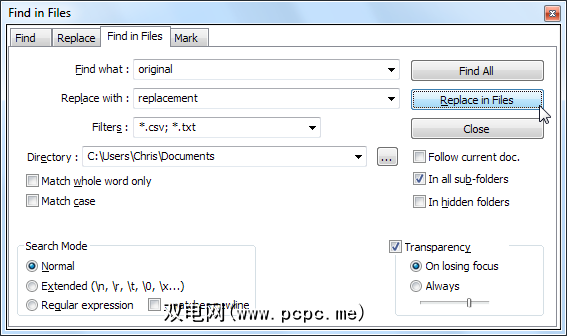 您可以在此处指定要执行搜索并替换的文件目录。默认情况下,Notepad ++将在此主目录下的子目录中执行所有文件的搜索和替换–如果您仅想对其中的文件执行搜索和替换,请取消选中在所有子文件夹中复选框。顶级目录。您还可以使用“过滤器"框仅对某些文件执行搜索和替换-例如,可以使用过滤器 *。csv 仅对.csv文件或 *。csv; * .txt 可以对.csv和.txt文件执行搜索和替换。