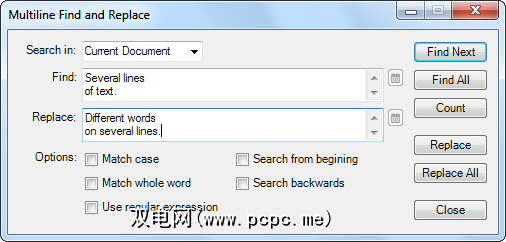重新启动Notepad ++以启用插件后,单击插件菜单,指向工具桶,然后选择多行查找和替换(或按Alt + Shift + F)。与Notepad ++的内置对话框不同,此对话框接受多行文本。