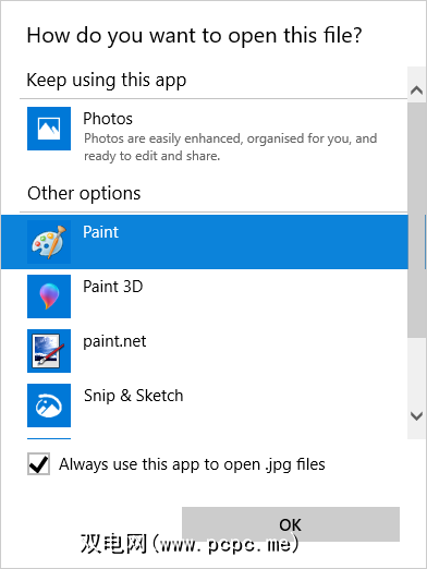 您将看到一个程序列表,您可以使用该列表来打开文件,但这只是一次,不会永久更改您的设置。要进行永久更改,请选择选择其他应用。