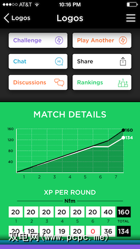 您还可以与对手聊天,查看每个给定排名主题,并在应用程序中类似论坛的部分中参与有关该主题的讨论。如果您真的很喜欢测验,则可以向下钻取以查看您和对手每回合可以赢得多少分,甚至可以看到折线图上显示的结果。