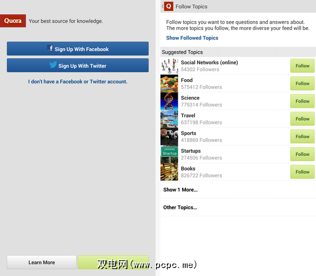 当您初次使用时启动Quora,立即要求您登录。这与该服务在网络上的行为是一致的:如果您未登录,则无法玩游戏。我已经有一个帐户,因此我登录了,并受到屏幕的欢迎,鼓励我关注一些主题。该服务试图猜测我所从事的事情,并且做得很好(除了体育方面的知识除外)。