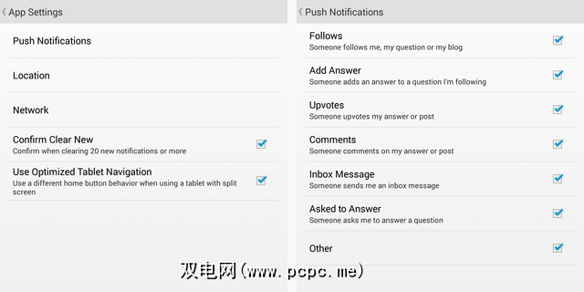 “设置"屏幕提供了三个子类别:推送通知,位置和网络。尽管很不幸,所有通知类型默认情况下都处于启用状态,但是您可以非常精确地控制应用程序何时应以通知方式中断您的通知: