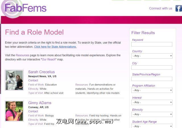 FabFems可能是您应该首先开始的地方想为你的女儿找一位导师。只需单击“查找榜样"链接,您就可以访问来自世界各地的非常庞大的女科学家名录,他们很乐意在您可能感兴趣的任何研究领域为您的女儿提供指导。