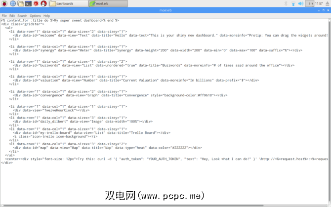您会发现项目文件位于 dashboard / sweet_dashboard_project / dashboard 下。默认安装包括一个名为 sample.erb 的erb文件。您可以使用它或自己制作。使用仪表板,可以使用具有不同名称的erb文件进行多个仪表板设计。然后只需导航到 localhost:3030 / [erb文件的名称] 即可查看其他仪表板。打开所需的erb文件,然后添加适当的HTML代码,以将新的小部件添加到仪表板。