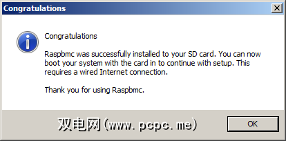 您的SD卡应显示在安装程序窗口中;选中该复选框,然后单击 Install ,该实用程序会将Raspbmc安装到介质上。当出现“ 祝贺"消息时,是时候将卡取出并放到Raspberry Pi中了。