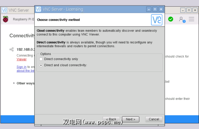 在RealVNC服务器上运行Pi时,您应该在PC上创建一个帐户。前往www.realvnc.com/download/vnc,从RealVNC获取VNC Viewer应用程序的副本,并按照首次启动时的步骤创建其服务帐户。完成此操作后,即可通过VNC Viewer远程连接到Raspberry Pi桌面。您需要输入之前创建的凭据。要访问VNC Connect服务,请在桌面面板中单击RealVNC图标,单击登录,然后按照说明进行操作,确保选择直接和云连接选项。