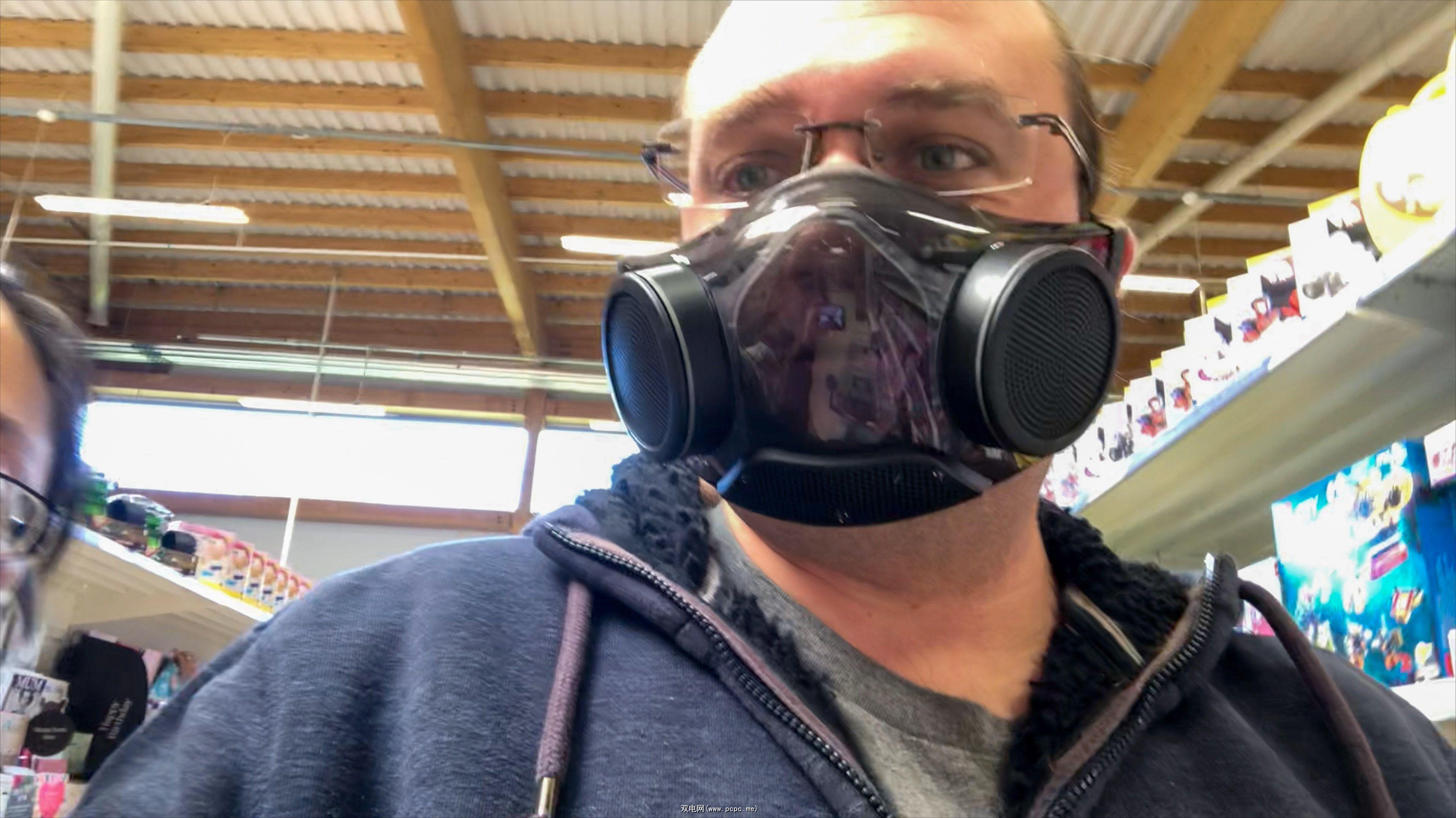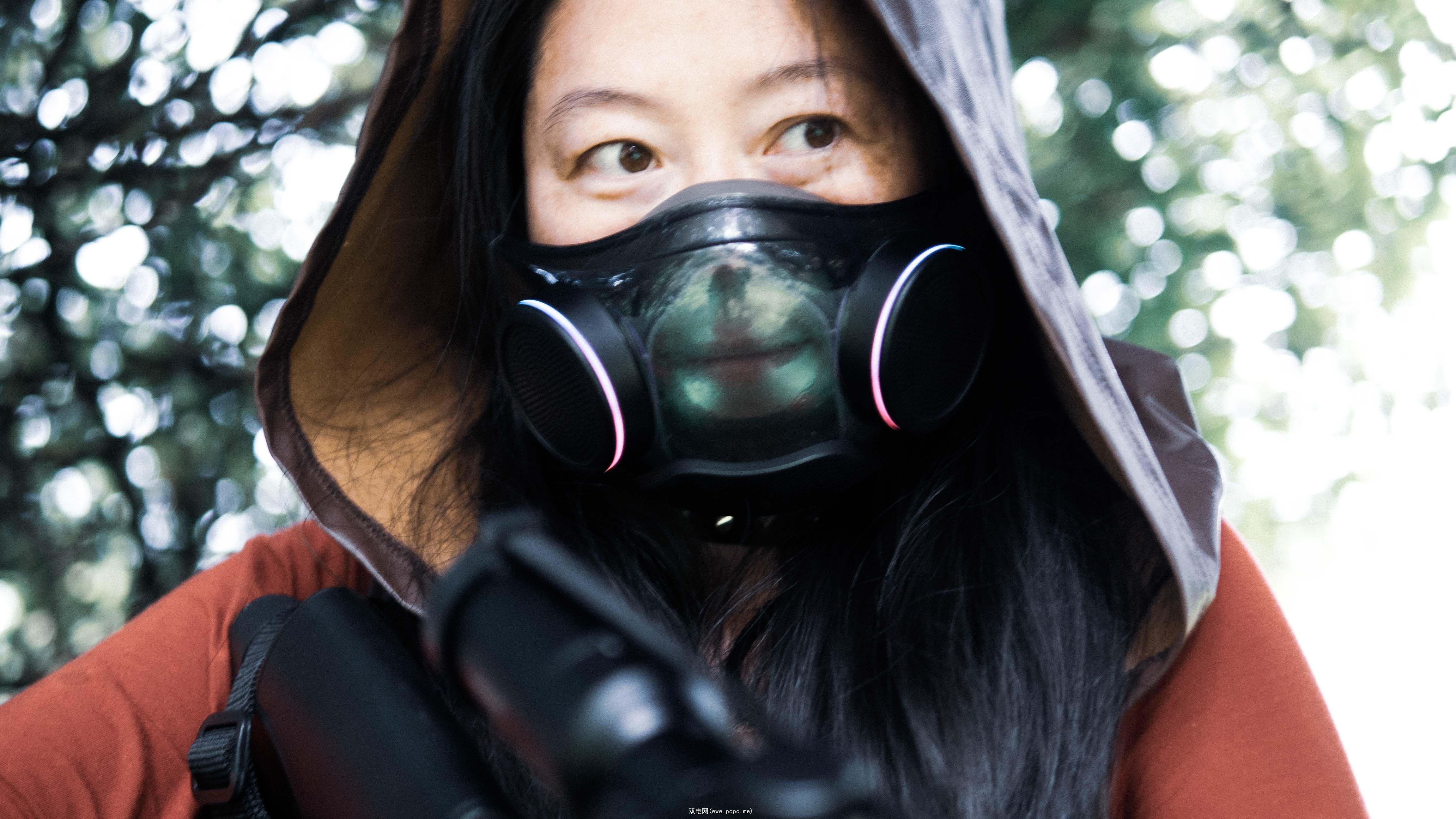 与工业口罩不同,其上的两个网状突起通常是可更换的 3M 过滤块,在这种情况下,它们装有风扇和一些 LED,可能还有小电池。