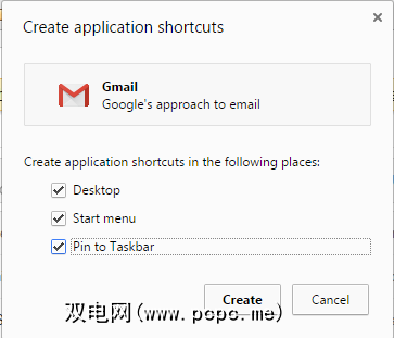 在Chrome中打开您的Gmail帐户。点击 Chrome设置图标(三行平行线,位于右上角),然后转到更多工具。在这里,您应该会看到创建应用程序快捷方式,一旦单击它,它将询问您要分配哪些选项。完成!