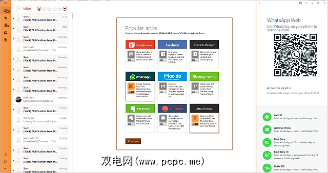 Mailbird非常令人高兴。如果GMDesk足智多谋,那么Mailbird便是天才。它之所以赢得 Best Windows Email Client 几个奖项是有原因的。 Mailbird应用程序的范围使其比其他桌面客户端更具优势。集成的WhatsApp,Facebook,Sunrise,Google Calendar和Evernote,再加上一些漂亮的附件管理工具,使它绝对钉在了我的桌面客户端列表上。 Mailbird API也将要公开,因此,希望扩展范围能够扩展。