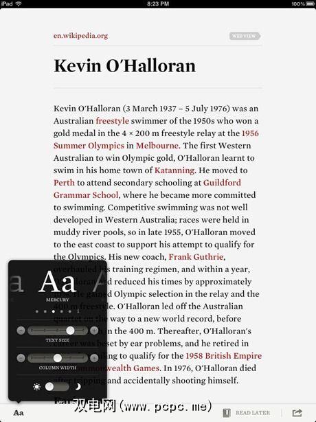 iOS应用程序包含一个内置的Web浏览器,您可以从中搜索任何网页。找到要阅读的文章后,请单击“ 立即阅读"按钮,以享受文章的可读版本,其中没有任何图像和不必要的混乱。然后,您可以轻松控制文本大小,列宽和背景颜色(浅色或深色)。您还可以选择“ 稍后阅读"将项目添加到阅读列表中。