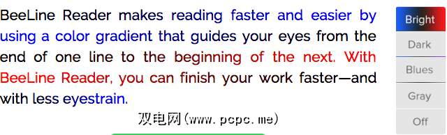 基本上,任何网站上每个句子的开头和结尾(如果您安装了Chrome扩展程序)或任何文本(如果您将其复制并粘贴到浏览器版本中),则可以多种颜色渐变显示,以引导您的眼睛并减少眼睛疲劳。