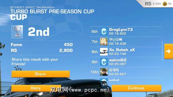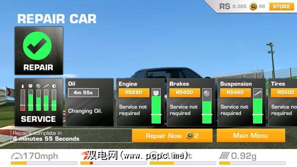像大多数免费游戏一样,有两种货币,一种可以在游戏中轻松赚钱,另一种稀疏的高级货币称为黄金。每次您升级游戏时,游戏都会向您授予金牌,并且您参加的每次比赛都将赚取标准货币。还包括基于时间的管理,尽管少于类似的免费游戏。每六到七场比赛,您将需要维修汽车的组件之一,这涉及等待或花费一些高级货币来跳过。