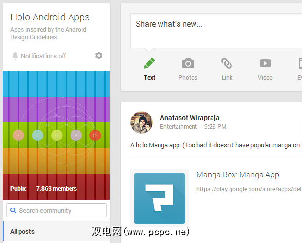 社区的好处是您不必认识任何人,他们只是一个地方讨论共同的利益,他们很容易结识新朋友。 Google+界面可轻松过滤社区噪音,每个社区都可以使用不同的帖子类型。例如,Holo Android应用社区可让您浏览讨论,开发人员推广的应用,甚至健康和健身应用。
