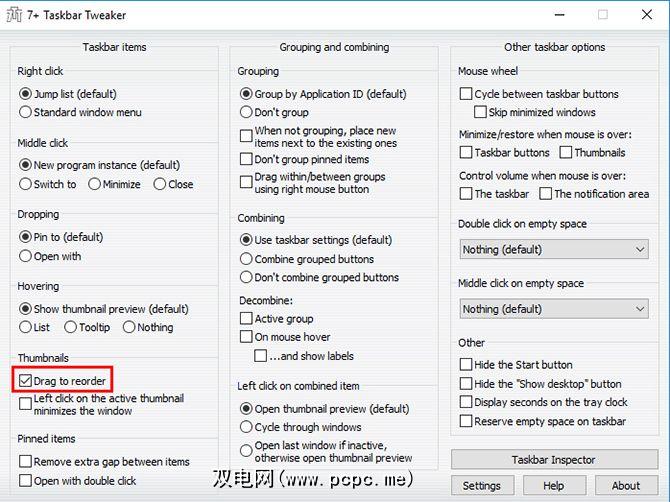 安装7+ Taskbar Tweaker后,在任务栏项>缩略图下,确保拖动以重新排序 >已选中。