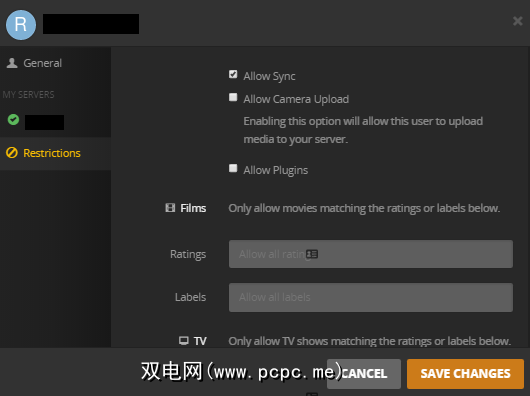 要允许其他用户将您的内容同步到他们的设备上,请打开Plex服务器并导航到设置>用户>我的主页> [用户名]>限制>允许同步。