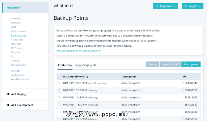 还原整个站点和数据库也只需从主机控制面板中单击即可。就这么简单。我不能足够强调此功能可节省多少时间和精力。