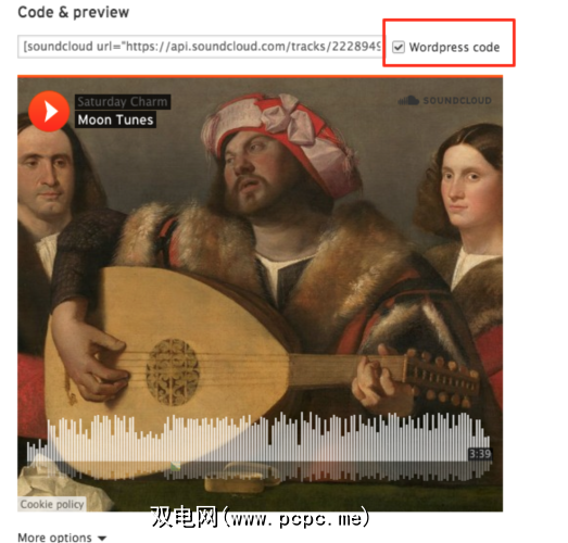 在此外,WordPress和SoundCloud制定了一项协议,以便您可以将歌曲或播放列表完美地集成到您的个人网站上。在SoundCloud上时,只需单击嵌入代码旁边的“ WordPress代码",复制该代码,然后粘贴到帖子中或页。简单。现在,您可以轻松地在您的站点上共享自己喜欢的曲目。