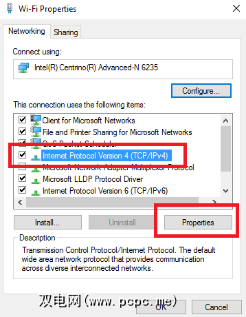 突出显示 Internet协议版本4(TCP / IPv4),然后单击属性。