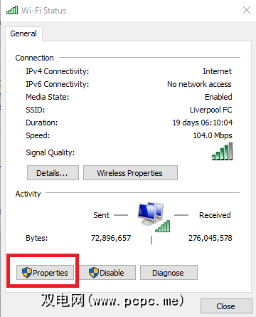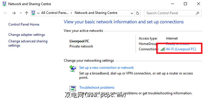 如果您运行的是Windows,则需要前往网络和共享中心进行设置变化。在工具栏中的Wi-Fi图标上右键单击,然后选择打开网络和共享中心。接下来,单击您的Wi-Fi网络的名称。