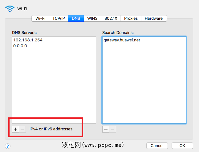 最后,单击左侧列下的 + 图标,然后输入新的DNS服务器地址。