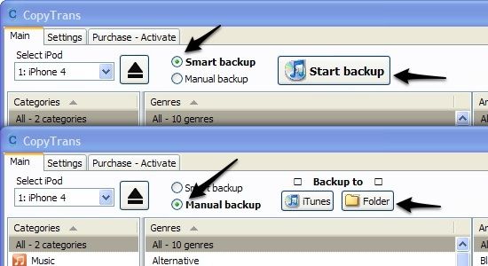 当需要将文件实际传输回时,CopyTrans 4提供了2个选项。第一个是“智能备份"选项-使用此方法,选定的媒体文件会自动添加回iTunes,但是会跳过重复的文件。使用“手动备份"方法,将要求您选择一个指定的文件夹来保存文件或备份到iTunes。